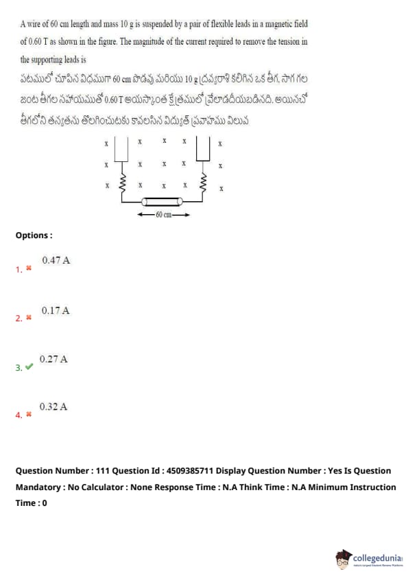 A wire of 60 cm length and mass 10 g is suspended by a pair of flexible leads in a magnetic field of 0.60 T as shown in the figure. The magnitude of the current required to remove the tension in the supporting leads is: