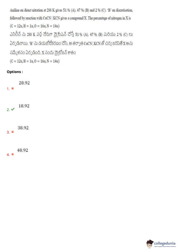 Aniline on direct nitration at 288 K gives 51% (A), 47% (B) and 2% (C). ‘B’ on diazotisation, followed by reaction with CuCN | KCN gives a compound X. The percentage of nitrogen in X is: