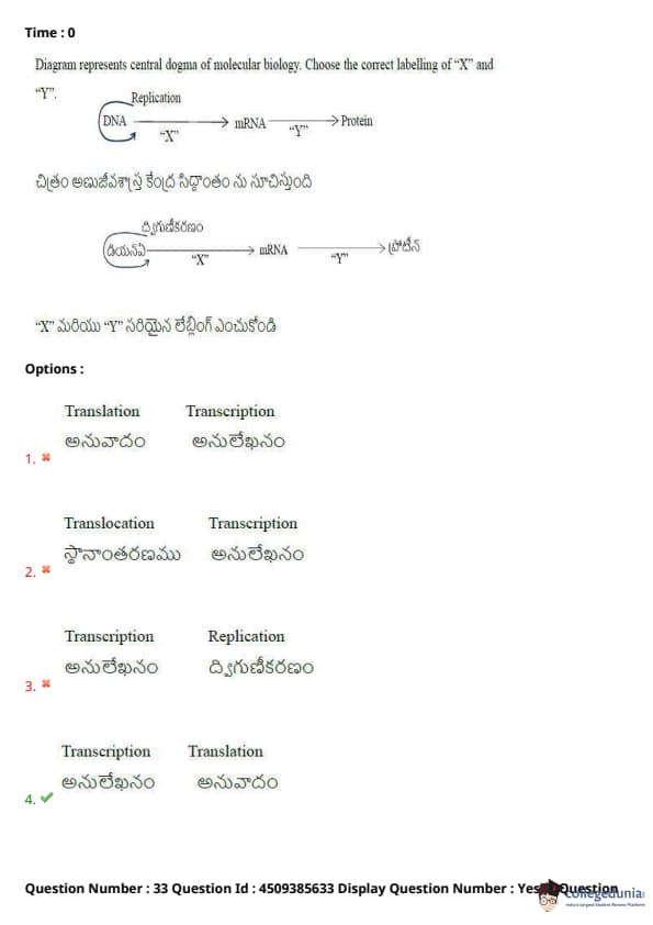 Diagram represents central dogma of molecular biology. Choose the correct labelling of "X" and "Y":