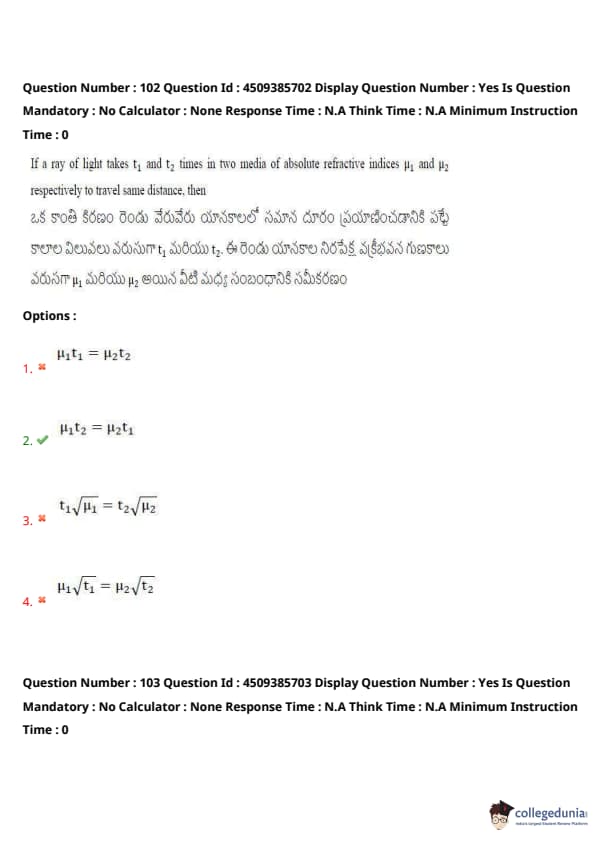 If a ray of light takes \(t_1\) and \(t_2\) times in two media of absolute refractive indices \(\mu_1\) and \(\mu_2\) respectively to travel same distance, then the relation between the times and refractive indices is: