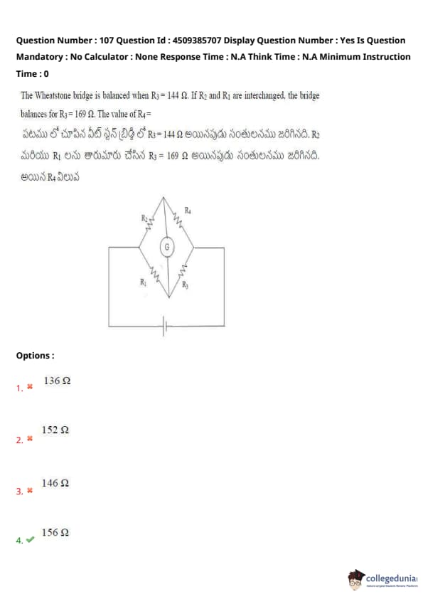 The Wheatstone bridge is balanced when \(R_3 = 144 \, \Omega\). If \(R_2\) and \(R_1\) are interchanged, the bridge balances for \(R_3 = 169 \, \Omega\). The value of \(R_4\) is: