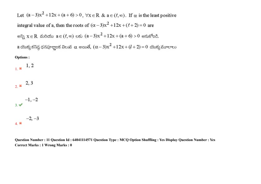 Let \((a-3)x^2 + 12x + (a+6) > 0, \forall x \in R and a \in (t, \infty)\). If \(\alpha\) is the least positive integral value of \(a\), then the roots of \((\alpha-3)x^2 + 12x + (\alpha+2) = 0\) are:
