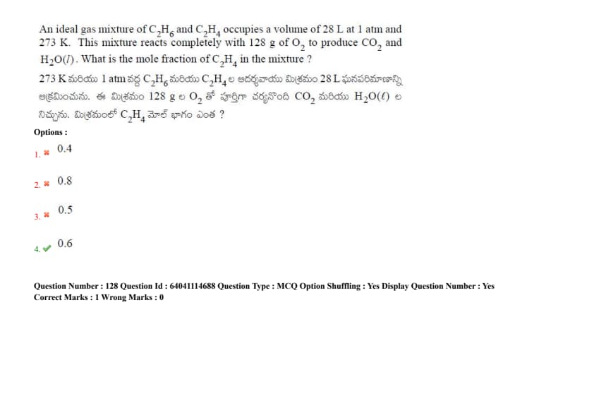 An ideal gas mixture of C\(_2\)H\(_6\) and C\(_2\)H\(_4\) occupies a volume of 28 L at 1 atm and 273 K. This mixture reacts completely with 128 g of O\(_2\) to produce CO\(_2\) and H\(_2\)O(\(l\)). What is the mole fraction of C\(_2\)H\(_4\) in the mixture ?