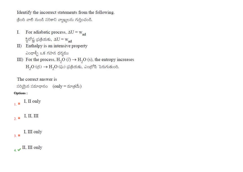 III. For the process \( H_2O(\ell) \rightarrow H_2O(s) \), the entropy increases.