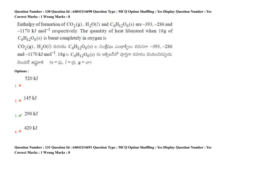 The enthalpies of formation of \( CO_2(g) \), \( H_2O(l) \), and \( C_6H_{12}O_6(s) \) are \( -393 \), \( -286 \), and \( -1170 \, kJ mol^{-1} \), respectively. The quantity of heat liberated when \( 18 \, g \) of \( C_6H_{12}O_6(s) \) is burnt completely in oxygen is.