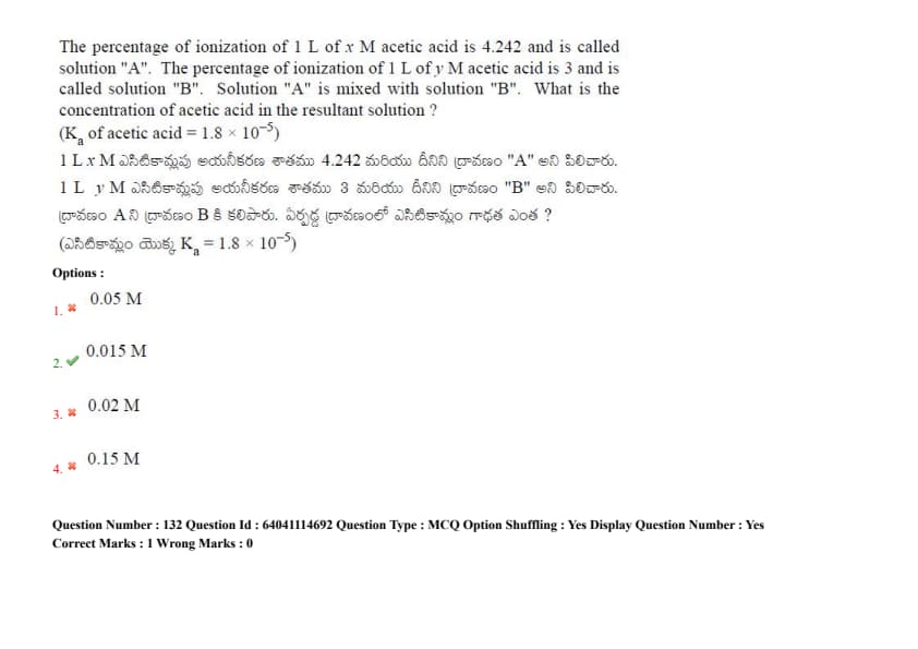 The percentage of ionization of \( 1 \, L \) of \( x \, M \) acetic acid is \( 4.242% \) and is called solution "A". The percentage of ionization of \( 1 \, L \) of \( y \, M \) acetic acid is \( 3% \) and is called solution "B". Solution "A" is mixed with solution "B". What is the concentration of acetic acid in the resultant solution? (\( K_a \) of acetic acid = \( 1.8 \times 10^{-5} \))