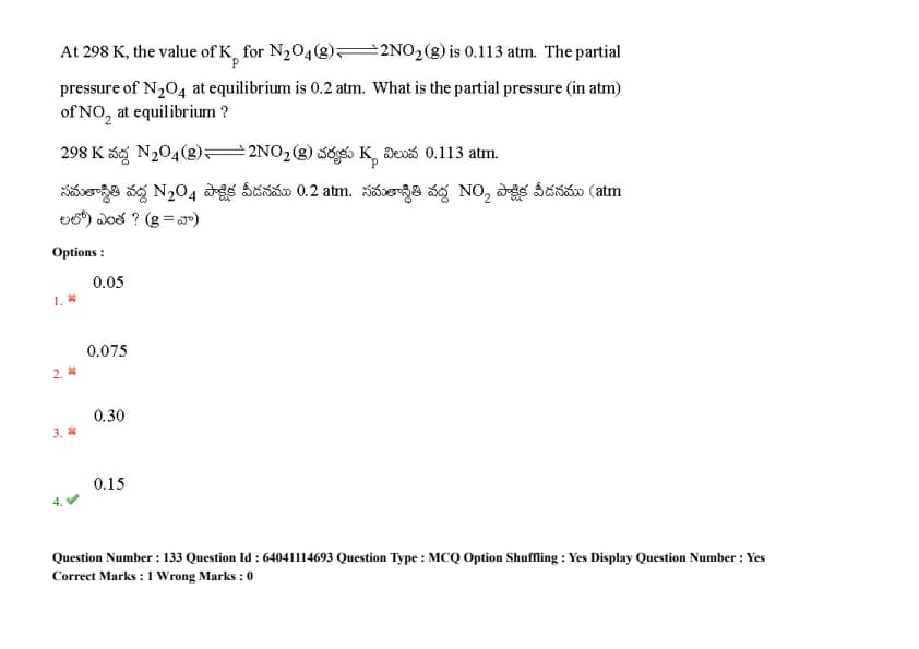 At 298 K, the value of K\(_p\) for N\(_2\)O\(_4\)(g) \(\rightleftharpoons\) 2NO\(_2\)(g) is 0.113 atm. The partial pressure of N\(_2\)O\(_4\) at equilibrium is 0.2 atm. What is the partial pressure (in atm) of NO\(_2\) at equilibrium ?