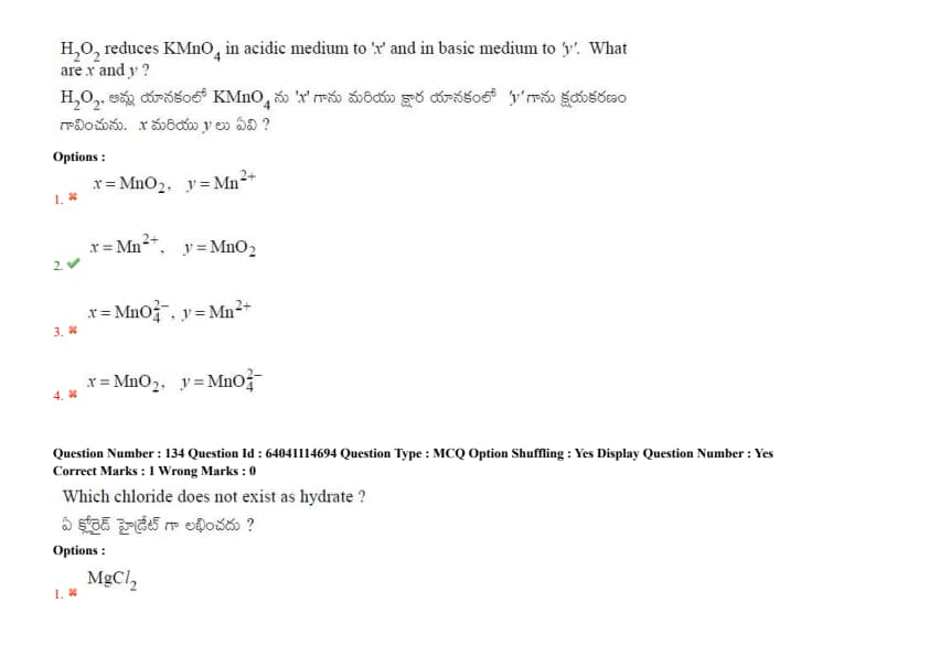 H\(_2\)O\(_2\) reduces KMnO\(_4\) in acidic medium to 'x' and in basic medium to 'y'. What are x and y?