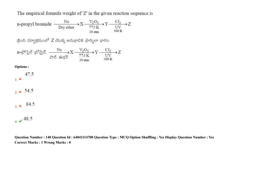 n-propyl bromide \(\xrightarrow{Na}\) X \(\xrightarrow{V_2O_5 773 K}\) Y \(\xrightarrow{Cl_2 UV 500 K}\) Z