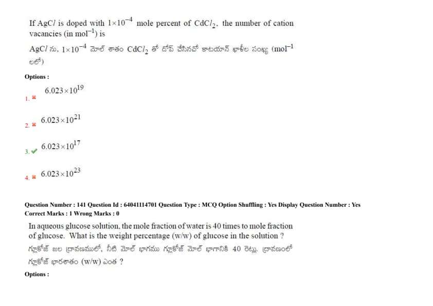 If AgCl is doped with \(1 \times 10^{-4}\) mole percent of CdCl\(_2\), the number of cation vacancies (in mol\(^{-1}\)) is