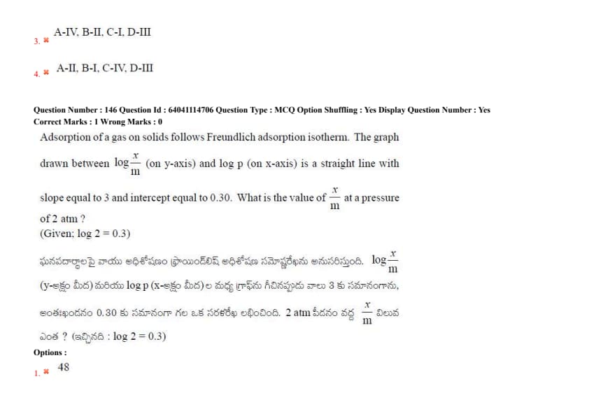 Adsorption of a gas on solids follows Freundlich adsorption isotherm. The graph drawn between log \(\frac{x}{m}\) (on y-axis) and log p (on x-axis) is a straight line with slope equal to 3 and intercept equal to 0.30. What is the value of \(\frac{x}{m}\) at a pressure of 2 atm ?