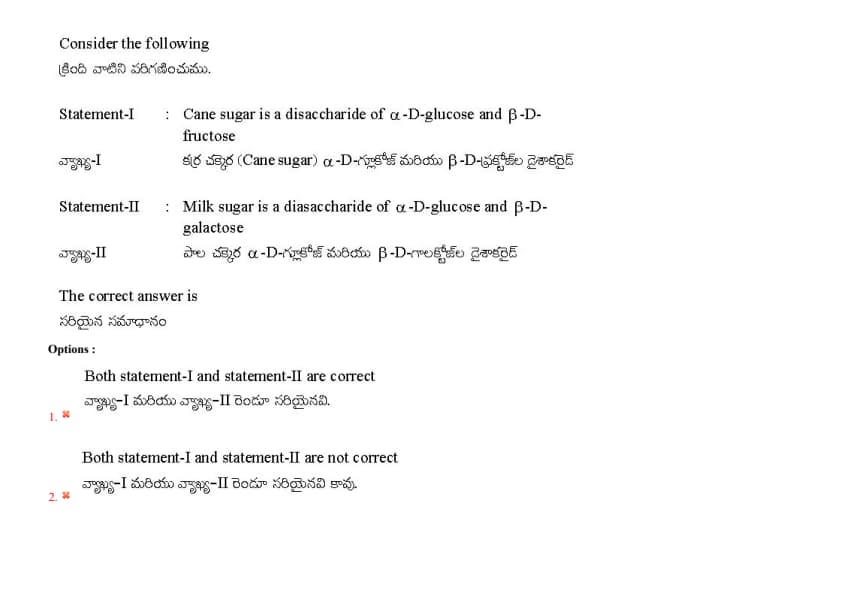 Statement-II: Milk sugar is a disaccharide of \(\alpha\)-D-glucose and \(\beta\)-D-galactose