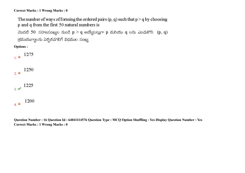 The number of ways of forming the ordered pairs (p, q) such that p > q by choosing p and q from the first 50 natural numbers is: