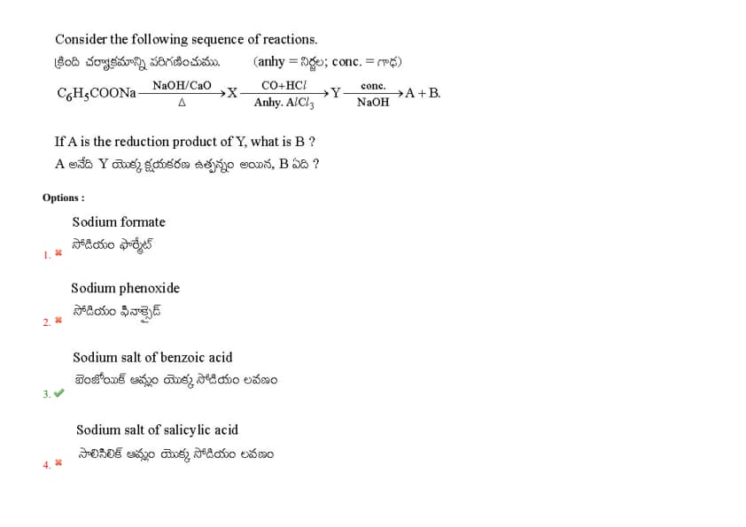 \(\operatorname{C}_6\operatorname{H}_5\operatorname{COONa} \xrightarrow{NaOH/CaO, \Delta}\) X \(\xrightarrow{CO+HCl, Anhy. AlCl_3}\) Y \(\xrightarrow{NaOH}\) A + B