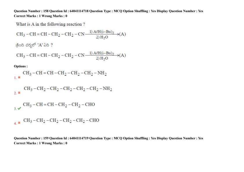\text{CH_3-\text{CH=\text{CH-\text{CH_2-\text{CH_2-\text{CN \xrightarrow{(1)\,A(\text{i-Bu)_2{(2)\,\text{H_2\text{O \rightarrow A \(\)