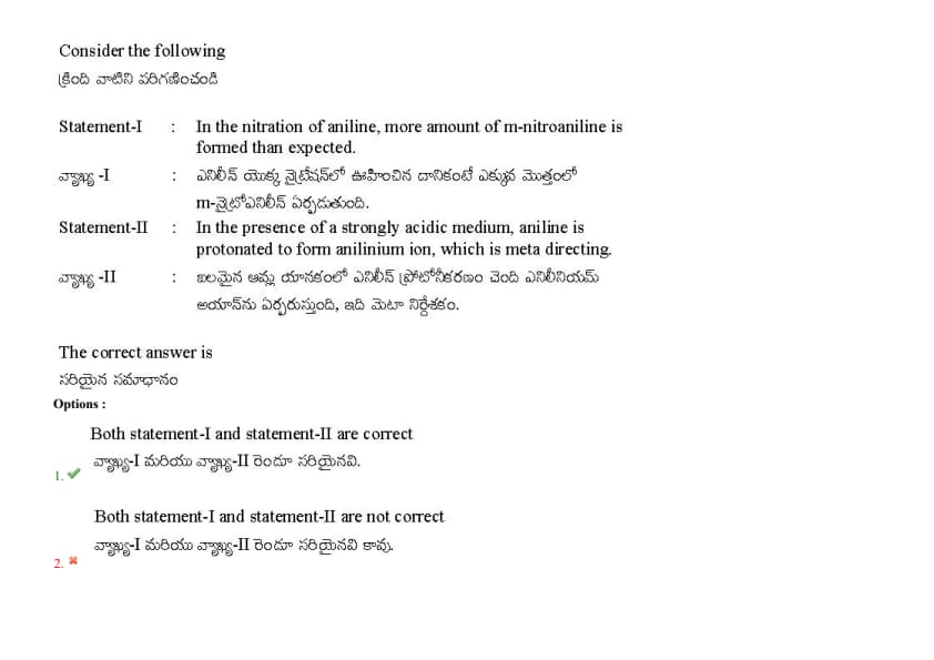 Statement-II: In the presence of a strongly acidic medium, aniline is protonated to form anilinium ion, which is meta directing.