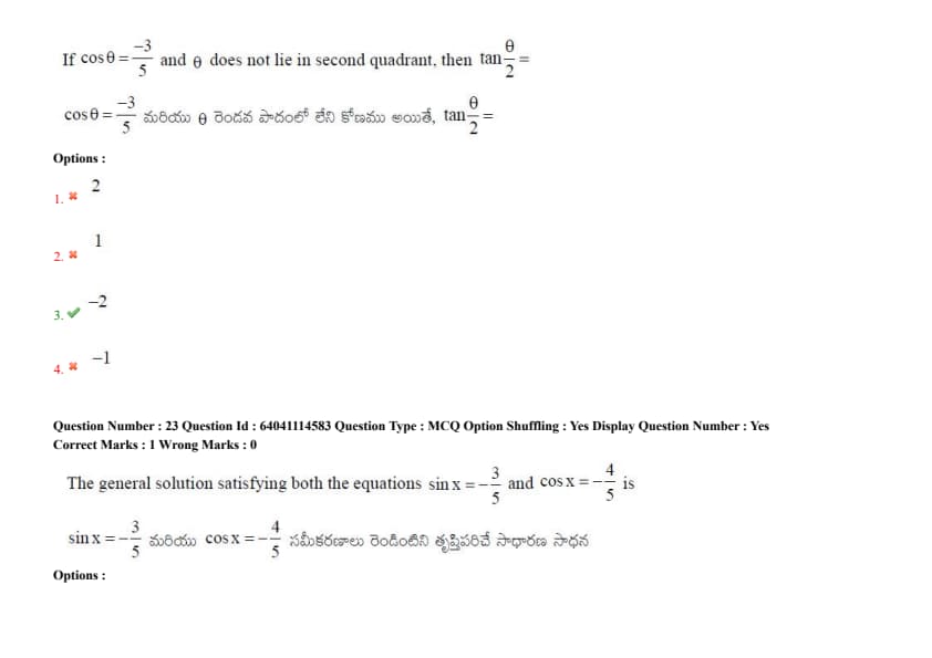 If \(\cos\theta = -\frac{3}{5}\) and \(\theta\) does not lie in second quadrant, then \(\tan\frac{\theta}{2} =\)