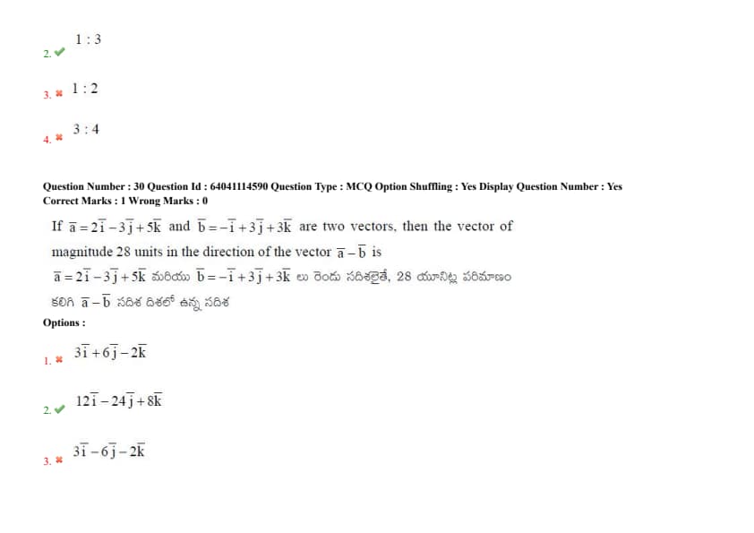 If \( \overline{a} = 2\overline{i} - 3\overline{j} + 5\overline{k} \) and \( \overline{b} = -\overline{i} + 3\overline{j} + 3\overline{k} \) are two vectors, then the vector of magnitude 28 units in the direction of the vector \( \overline{a} - \overline{b} \) is: