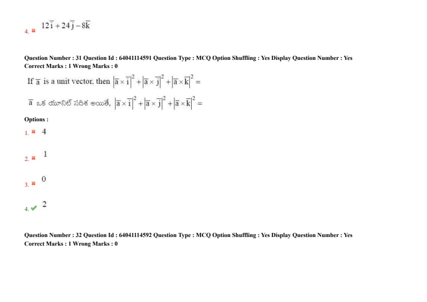 If \( \overline{a} \) is a unit vector, then \( |\overline{a} \times \overline{i}|^2 + |\overline{a} \times \overline{j}|^2 + |\overline{a} \times \overline{k}|^2 = \)