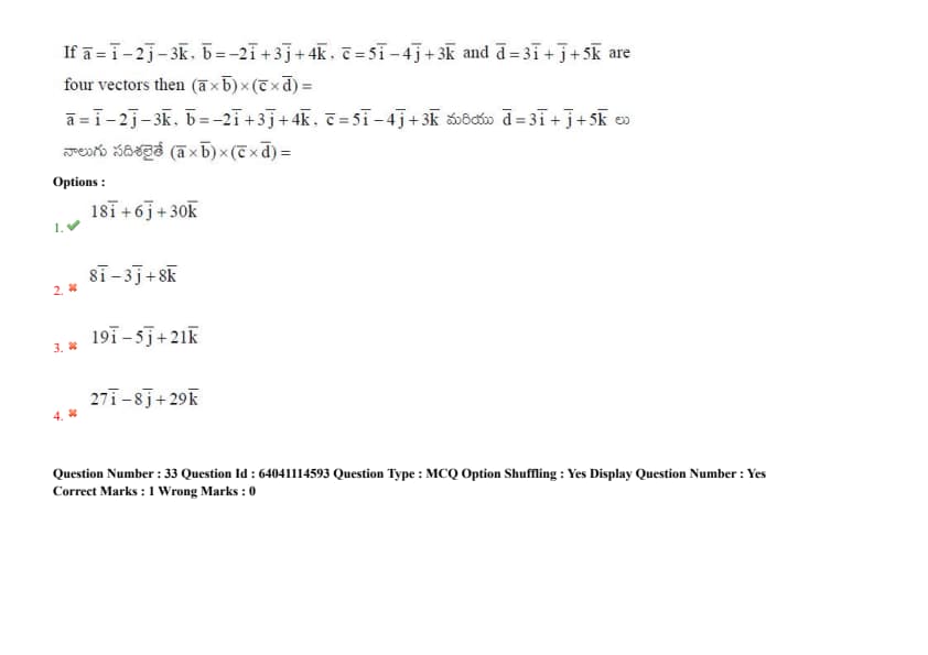 If \( \overline{a} = \overline{i} - 2\overline{j} - 3\overline{k} \), \( \overline{b} = -2\overline{i} + 3\overline{j} + 4\overline{k} \), \( \overline{c} = 5\overline{i} - 4\overline{j} + 3\overline{k} \), and \( \overline{d} = 3\overline{i} + \overline{j} + 5\overline{k} \) are four vectors, then \( (\overline{a} \times \overline{b}) \cdot (\overline{c} \times \overline{d}) = \)