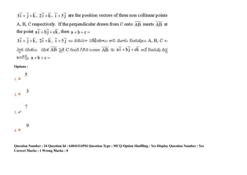 If \( 3\overline{i} + \overline{j} + \overline{k} \), \( 2\overline{i} + \overline{k} \), and \( \overline{i} + 5\overline{j} \) are the position vectors of three non-collinear points A, B, C respectively. If the perpendicular drawn from C onto \( \overline{AB} \) meets \( \overline{AB} \) at the point \( a\overline{i} + b\overline{j} + c\overline{k} \), then \( a + b + c = \)