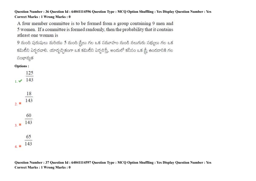 A four member committee is to be formed from a group containing 9 men and 5 women. If a committee is formed randomly, then the probability that it contains atleast one woman is