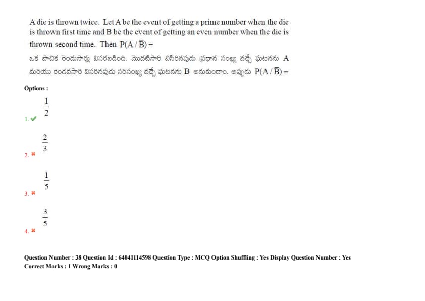 A die is thrown twice. Let A be the event of getting a prime number when the die is thrown first time and B be the event of getting an even number when the die is thrown second time. Then \(P(A/B) =\)