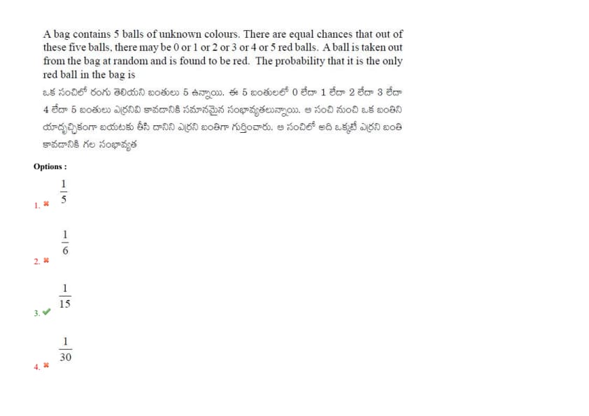 A bag contains 5 balls of unknown colors. There are equal chances that out of these five balls, there may be 0 or 1 or 2 or 3 or 4 or 5 red balls. A ball is taken out from the bag at random and is found to be red. The probability that it is the only red ball in the bag is: