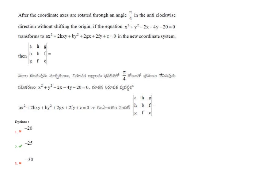 After the coordinate axes are rotated through an angle \(\frac{\pi}{4}\) in the anti clockwise direction without shifting the origin, if the equation \(x^2 + y^2 - 2x - 4y - 20 = 0\) transforms to \(ax^2 + 2hxy + by^2 + 2gx + 2fy + c = 0\) in the new coordinate system, then \(\begin{vmatrix} a & h & g