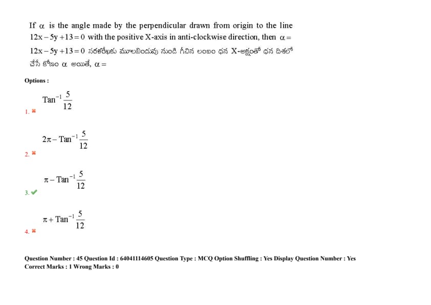 If \(\alpha\) is the angle made by the perpendicular drawn from origin to the line \(12x - 5y + 13 = 0\) with the positive X-axis in anti-clockwise direction, then \(\alpha =\)