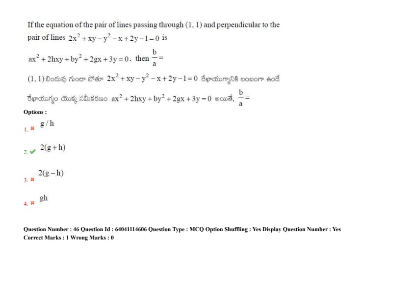 If the equation of the pair of lines passing through (1, 1) and perpendicular to the pair of lines \(2x^2 + xy - y^2 - x + 2y - 1 = 0\) is \(ax^2 + 2hxy + by^2 + 2gx + 3y = 0\). then \(\frac{b}{a} =\)
