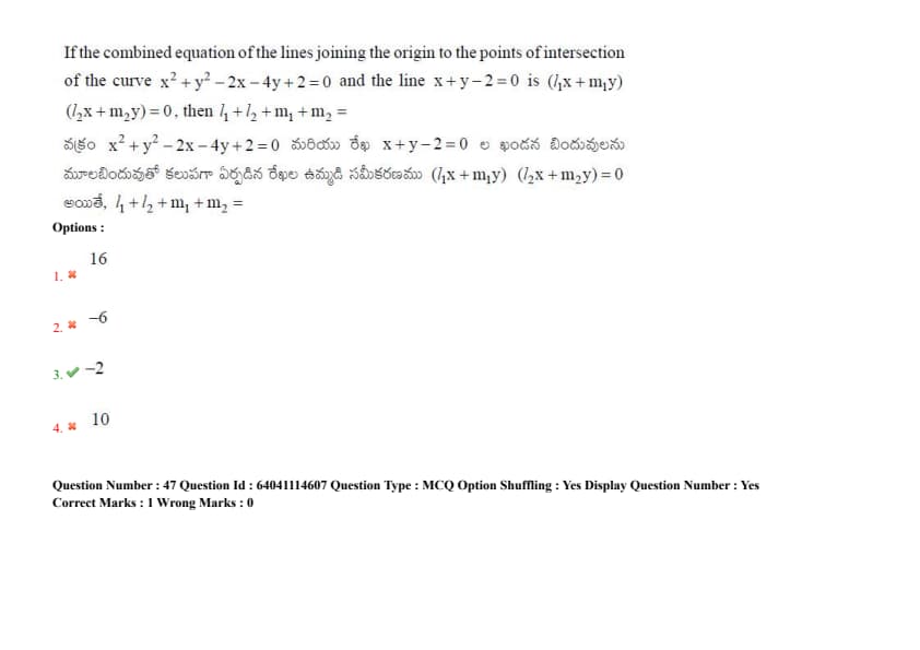 If the combined equation of the lines joining the origin to the points of intersection of the curve \( x^2 + y^2 - 2x - 4y + 2 = 0 \) and the line \( x + y - 2 = 0 \) is \( (l_1x + m_1y)(l_2x + m_2y) = 0 \), then \( l_1 + l_2 + m_1 + m_2 = \)