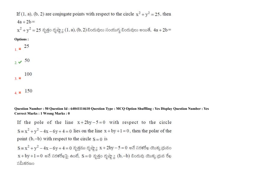 If (1, a), (b, 2) are conjugate points with respect to the circle \(x^2 + y^2 = 25\), then \(4a + 2b =\)