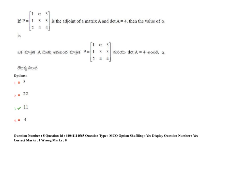 2 & 4 & 4 \end{bmatrix} \) is the adjoint of a matrix \( A \) and \( \det(A) = 4 \), then the value of \( \alpha \) is: