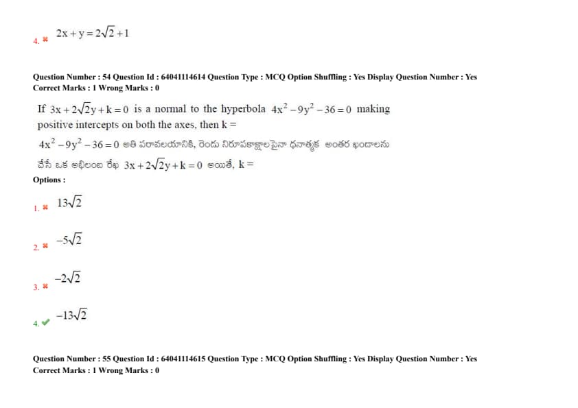 If \(3x+2\sqrt{2}y+k=0\) is a normal to the hyperbola \(4x^2-9y^2-36=0\) making positive intercepts on both the axes, then \(k=\)