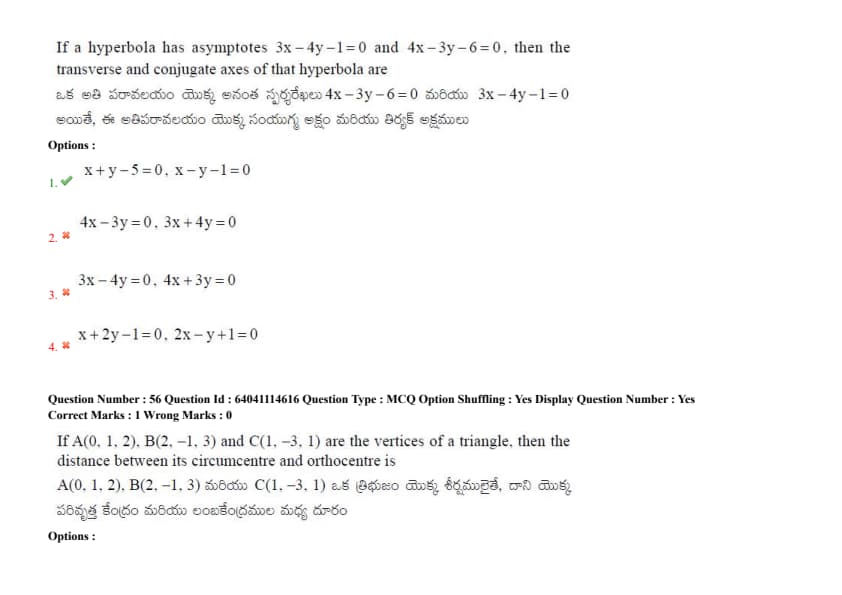 If a hyperbola has asymptotes \(3x-4y-1=0\) and \(4x-3y-6=0\), then the transverse and conjugate axes of that hyperbola are