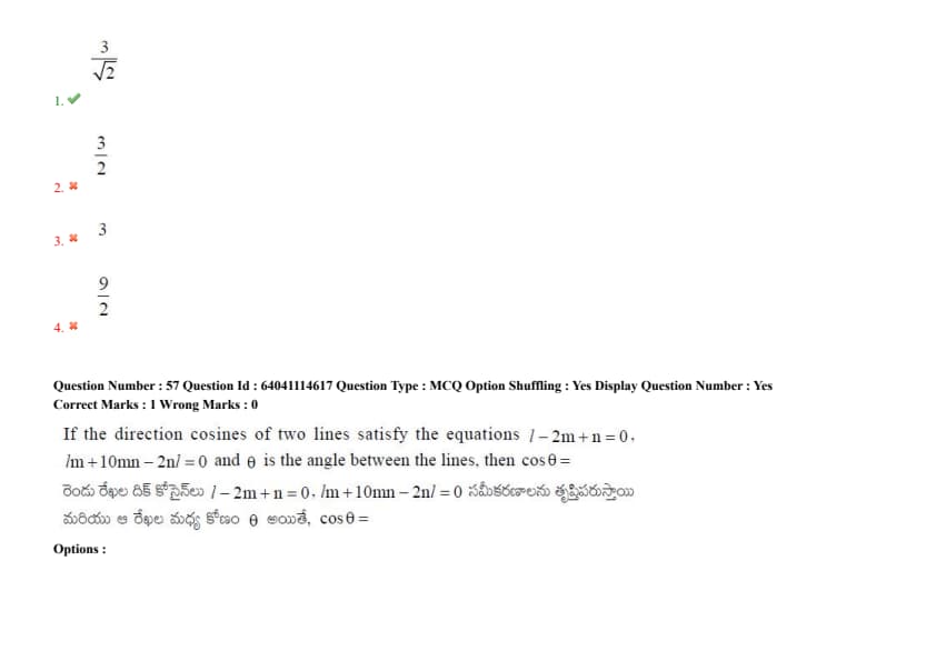 If the direction cosines of two lines satisfy the equations \( l - 2m + n = 0 \) and \( lm + 10mn - 2nl = 0 \), and \( \theta \) is the angle between the lines, then \( \cos \theta = \)