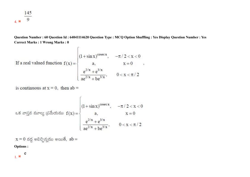 If a real valued function \(f(x) = \begin{cases} (1 + \sin x)^{\operatorname{cosec} x} & , -\pi/2 < x < 0