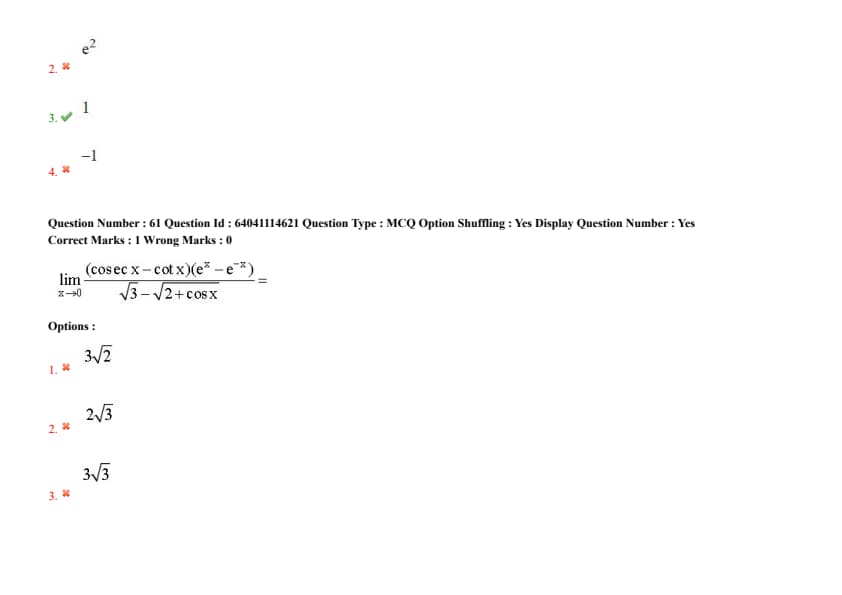 Evaluate the limit: \(\lim_{x \to 0} \frac{(\operatorname{cosec} x - \cot x)(e^x - e^{-x})}{\sqrt{3} - \sqrt{{2} + \cos x}}\)