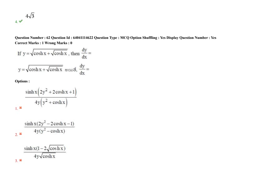 If \(y = \sqrt{\cosh x + \sqrt{\cosh x}}\), then \(\frac{dy}{dx} =\)