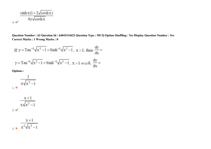 If \( y = \tan^{-1}\sqrt{x^2 - 1} + \sinh^{-1}\sqrt{x^2 - 1} \), \( x > 1 \), then \( \frac{dy}{dx} = \)