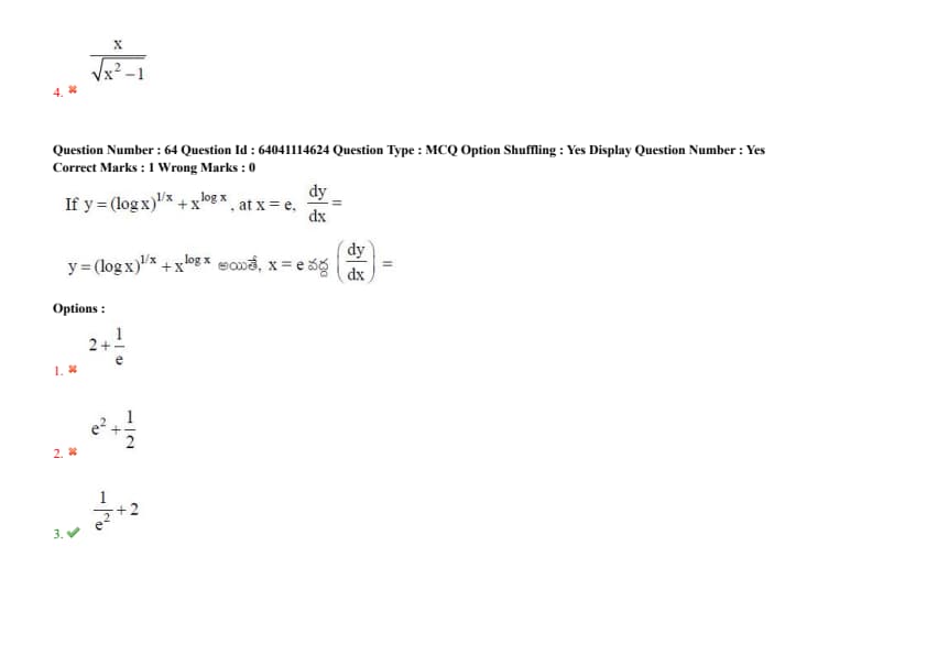 If \( y = (\log x)^{1/x} + x^{\log x} \), then at \( x = e \), \( \frac{dy}{dx} \) equals: