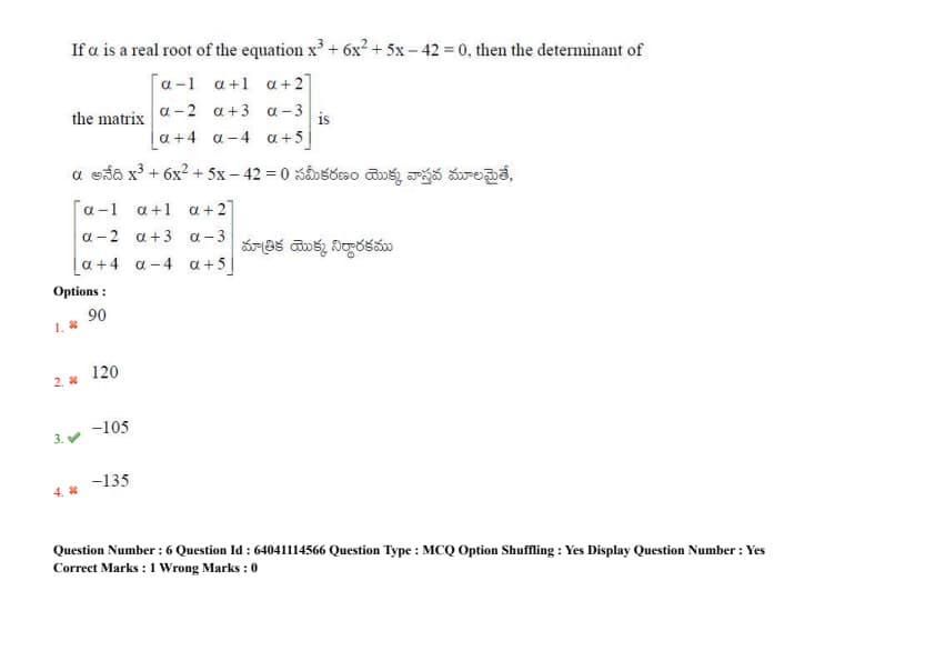 If \( \alpha \) is a real root of the equation \( x^3 + 6x^2 + 5x - 42 = 0 \), then the determinant of the matrix