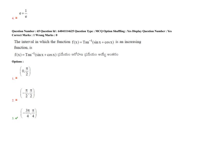 The interval in which the function \( f(x) = \tan^{-1}(\sin x + \cos x) \) is an increasing function, is: