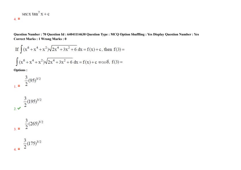 If \( \int \left( x^6 + x^4 + x^2 \right) \sqrt{2x^4 + 3x^2 + 6} \, dx = f(x) + c \), then \( f(3) = \)
