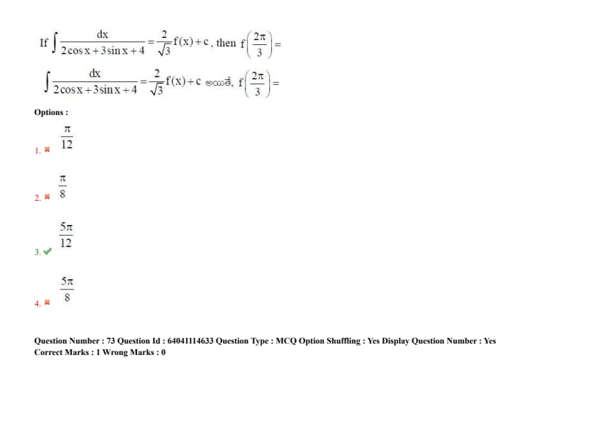 If \( \int \frac{dx}{2\cos x + 3\sin x + 4} = \frac{2}{\sqrt{3}}f(x) + c \), then \( f\left(\frac{2\pi}{3}\right) = \)