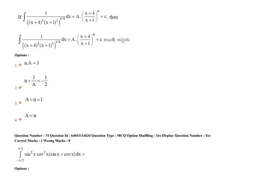 If \(\int \frac{1}{((x+4)^3 (x+1)^5)^{1/4}} dx = A \cdot \left(\frac{x+4}{x+1}\right)^n + c\), then