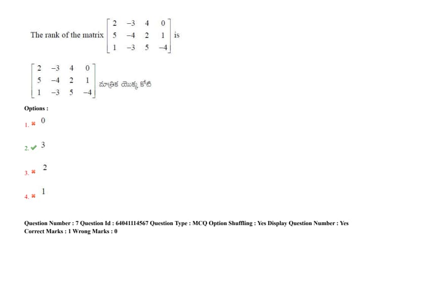 The rank of the matrix \( \begin{bmatrix} 2 & -3 & 4 & 0