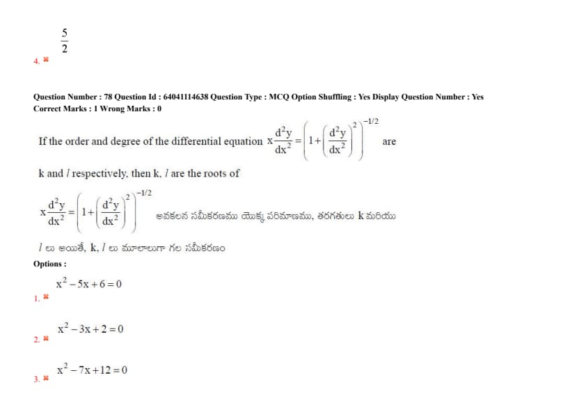 If the order and degree of the differential equation \(x \frac{d^2 y}{dx^2} = \left(1 + \left(\frac{d^2 y}{dx^2}\right)^2\right)^{-1/2}\) are \(k\) and \(l\) respectively, then \(k, l\) are the roots of