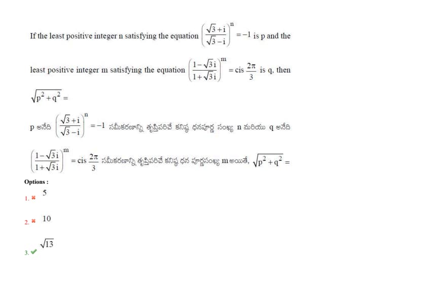 If the least positive integer n satisfying the equation \(\left(\frac{\sqrt{3}+i}{\sqrt{3}-i}\right)^n = -1\) is p and the least positive integer m satisfying the equation \(\left(\frac{1-\sqrt{3}i}{1+\sqrt{3}i}\right)^m = cis\left(\frac{2\pi}{3}\right)\) is q, then \(\sqrt{p^2 + q^2}\) is equal to: